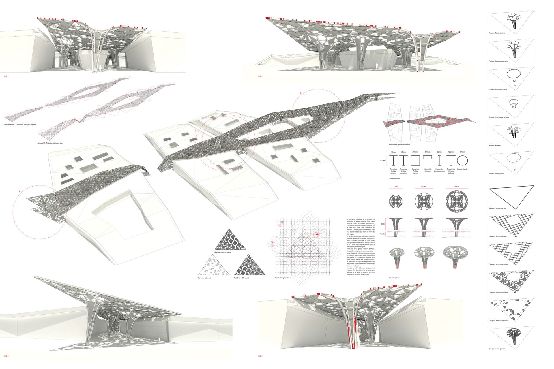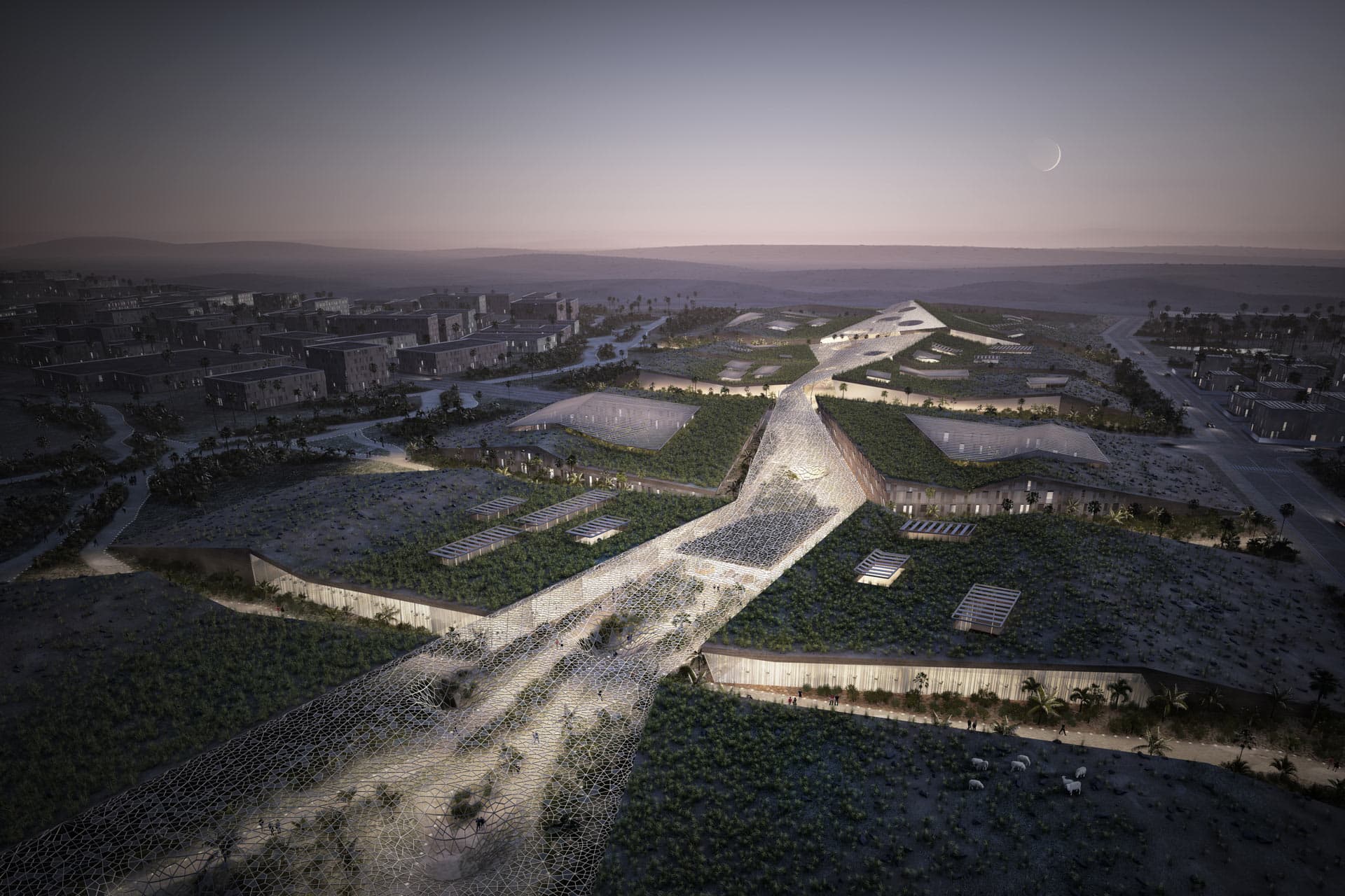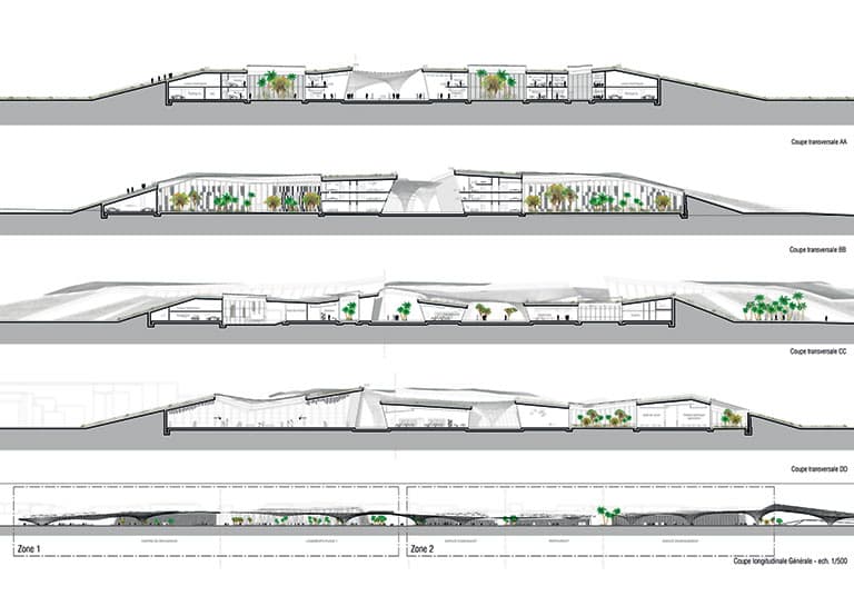 Our approach is based on the potential and assets of the site located in the middle of the wadi by optimizing the dialogue between the built environment and its surroundings. We use the climate, winds, sand, and know-how of the sub-saharan coast to achieve the best sustainable performance. Vegetated tents, half-tents / half-dunes, under which the buildings are slid, weave the landscape. Following the lines of the desert dunes, the interior street and its transversals are an allegory to the cracked lands of the wadi. Covered with a canopy, they leave an important place for nature and create spaces for meetings and exchanges between people.