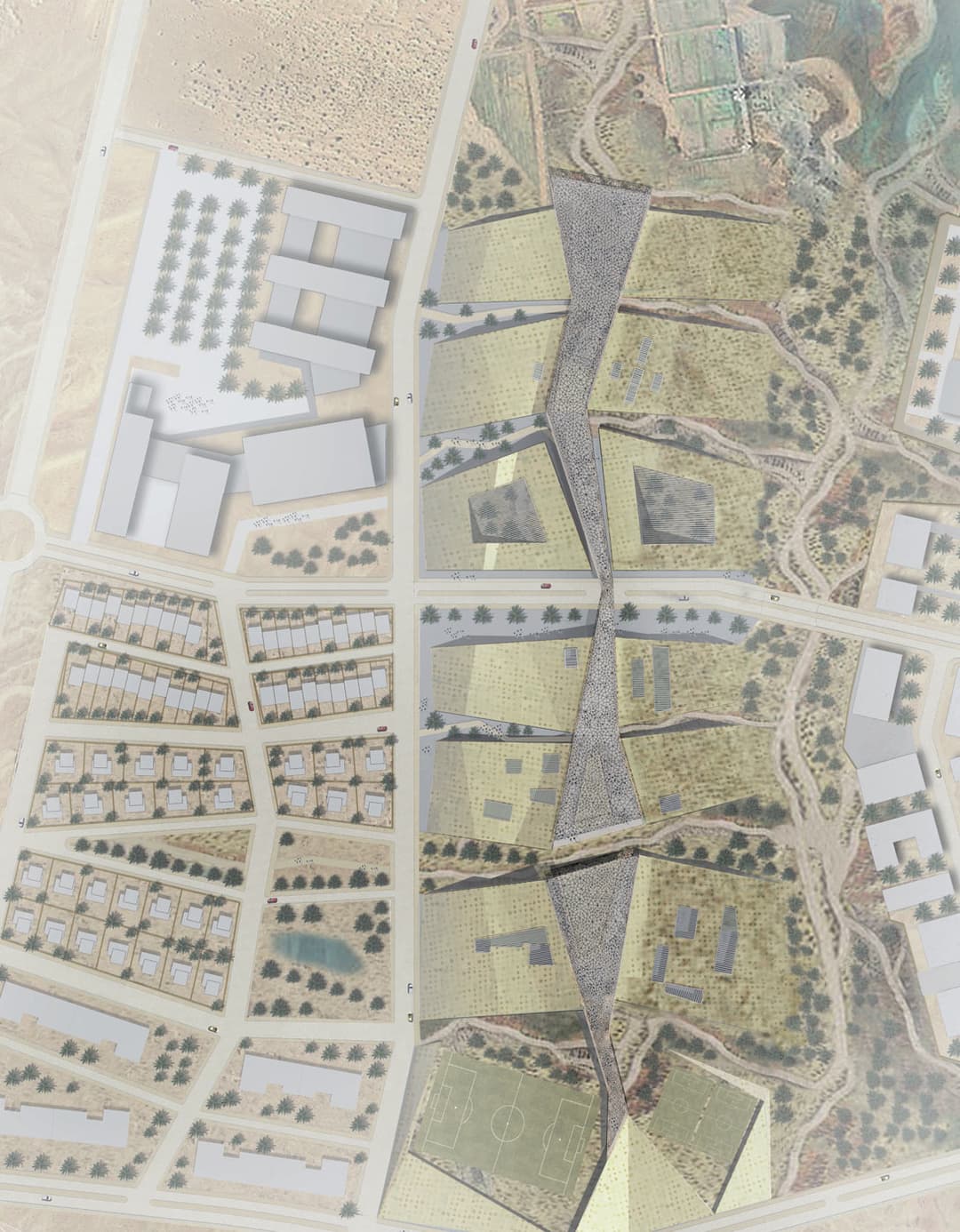 The interior street and its transversals are an allegory to the cracked lands of the wadi.
