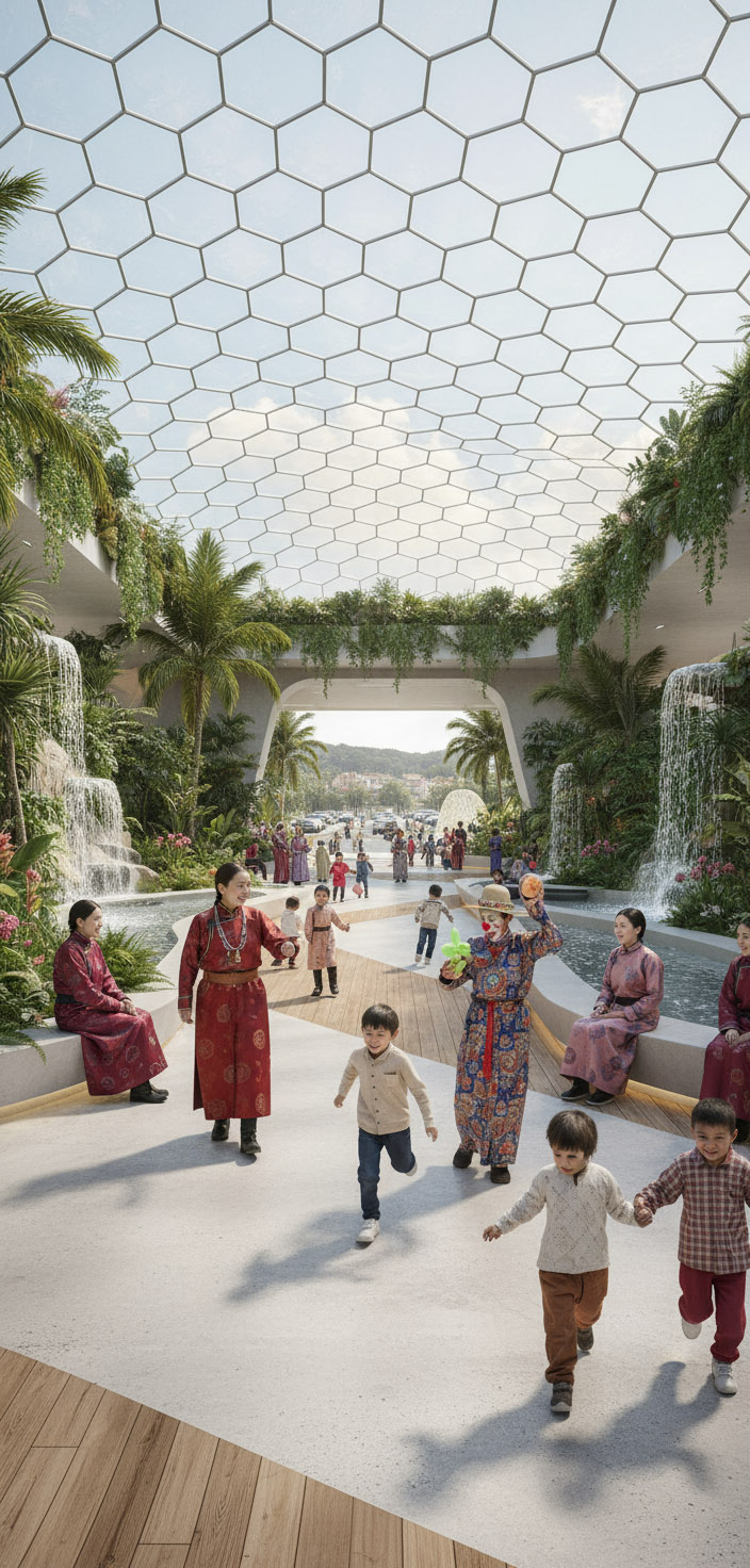 From the very first sketches, the decision was made not to impose an abstract urban form, but to let the territory guide the project, starting from the steppe, its winds, its waters and its cycles. The city is conceived as a living organism that observes, listens and then unfolds through the integration of its flows, captured, slowed and reused water, solar and thermal energies, ecological corridors for biodiversity, soft mobilities and a “15-minute city” framework. Guided by the symbolism of the number 9, sacred in Mongolian tradition, the masterplan is structured around nine founding pillars, origins, human–nature relationship, living heritage, symbiosis, constellation, nourishing soil, resilience, co-evolution and time, which shape the long-term vision for Hunnu City.