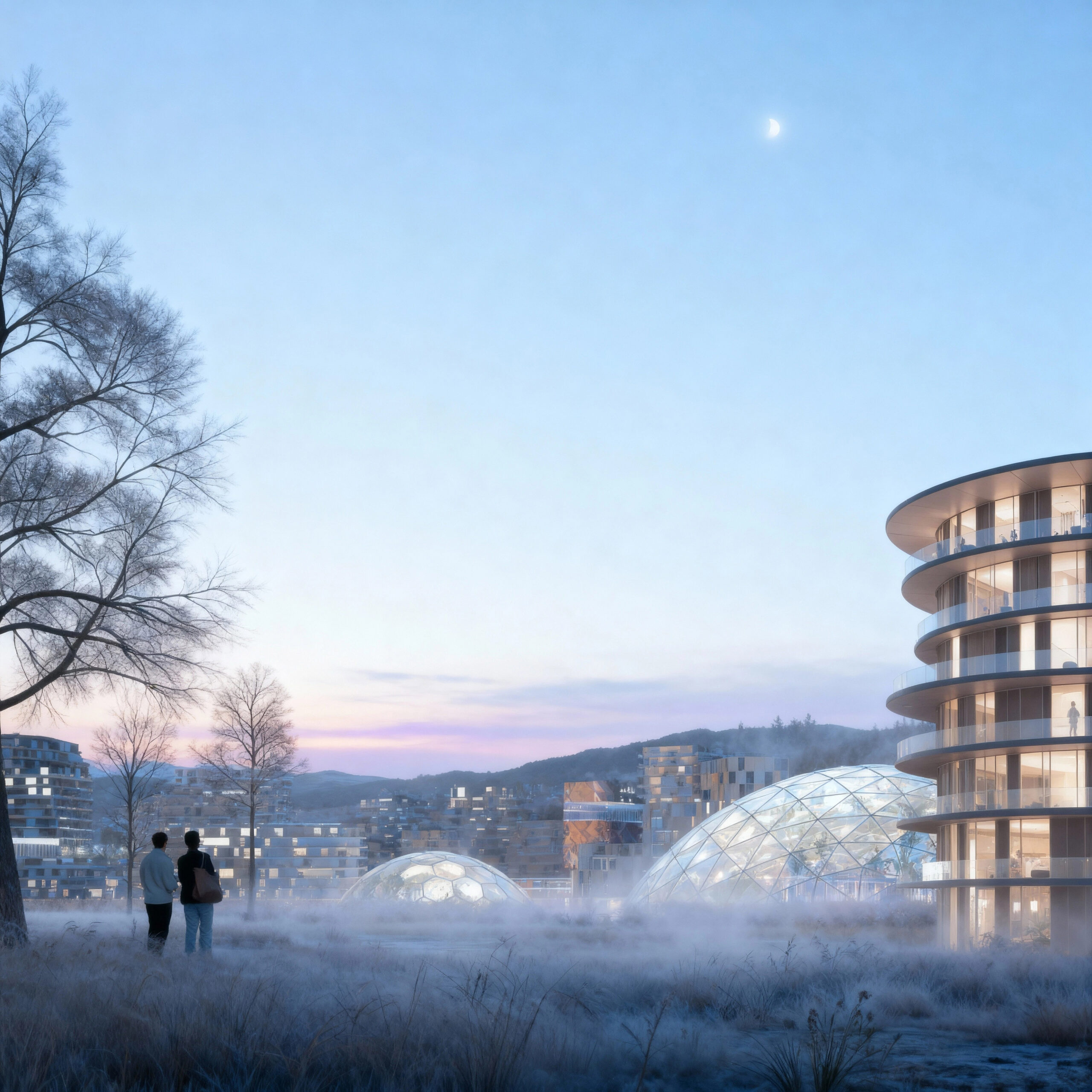 At the heart of the project, we imagine the Amid Od, literally stars of life, which structure the whole city as a contemporary constellation. These circular centres, inspired by the ger, the Mongolian yurt, become new identity markers for future generations, acting at once as cultural, social, energy and food hubs. Each Amid Od serves as a neighbourhood heart and climatic refuge, accommodating public spaces, gardens, places for culture, sport, education and work, while ensuring close access to essential services within a fifteen-minute city framework. Designed as climatic biomes with light, demountable envelopes, they provide comfortable conditions all year round despite harsh winters, thanks to passive solar gains, heat recovery and rainwater harvesting.