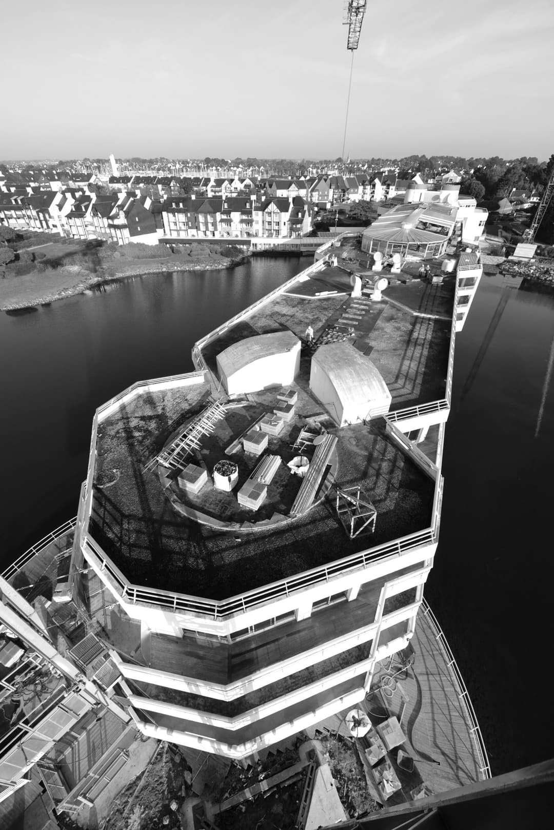 With its astonishing and unique architecture, which looks like an docked cruise ship with its decks and cabins, the hotel is anchored in the middle of a lake of retained sea water.