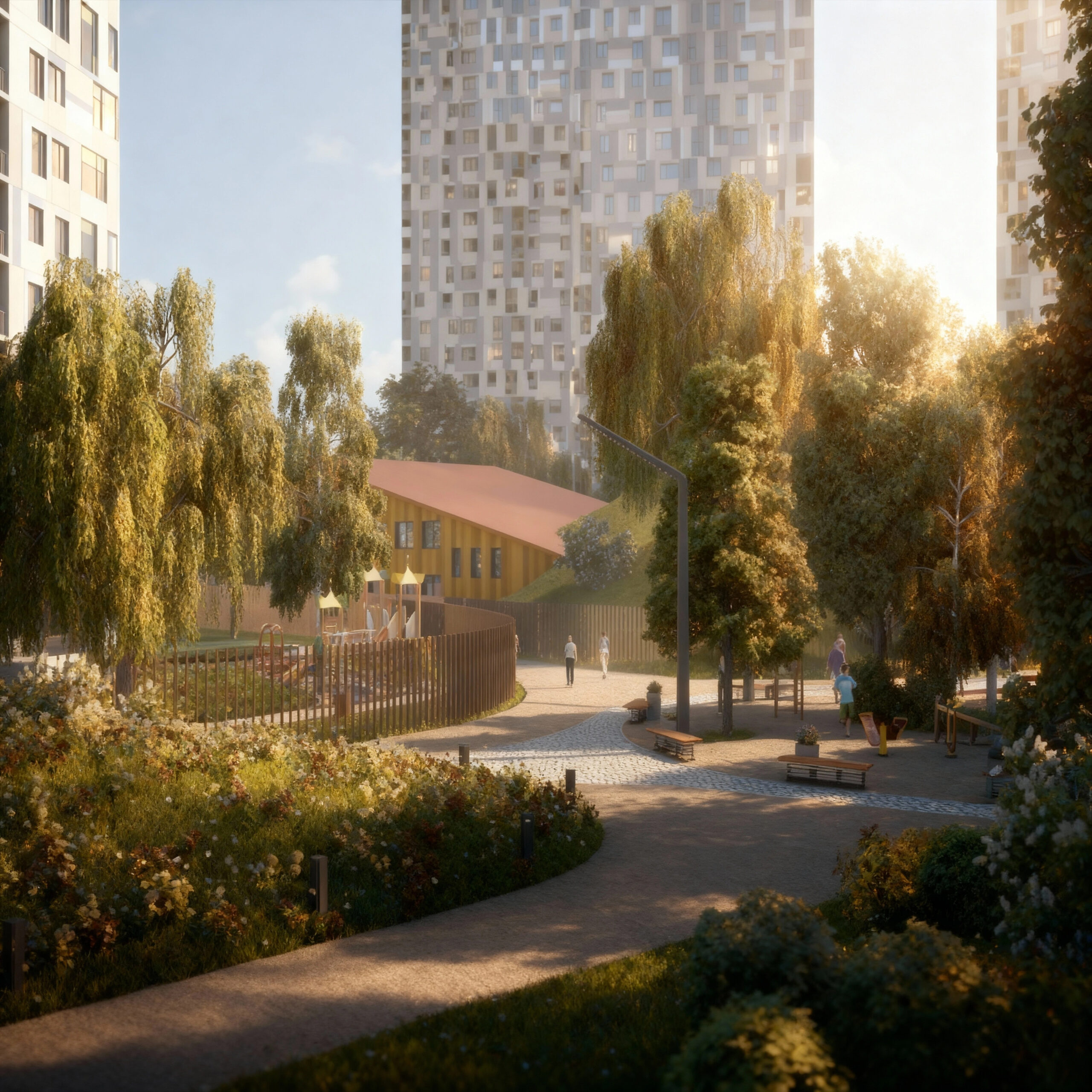 - Reusing the plots of the demolished “Dacha” buildings to reconstruct on the exact same locations made it possible to minimize the project’s carbon footprint. A circular road serves each building and is the only one accessible to vehicles. All other paths are reserved for pedestrians, weaving through the park.