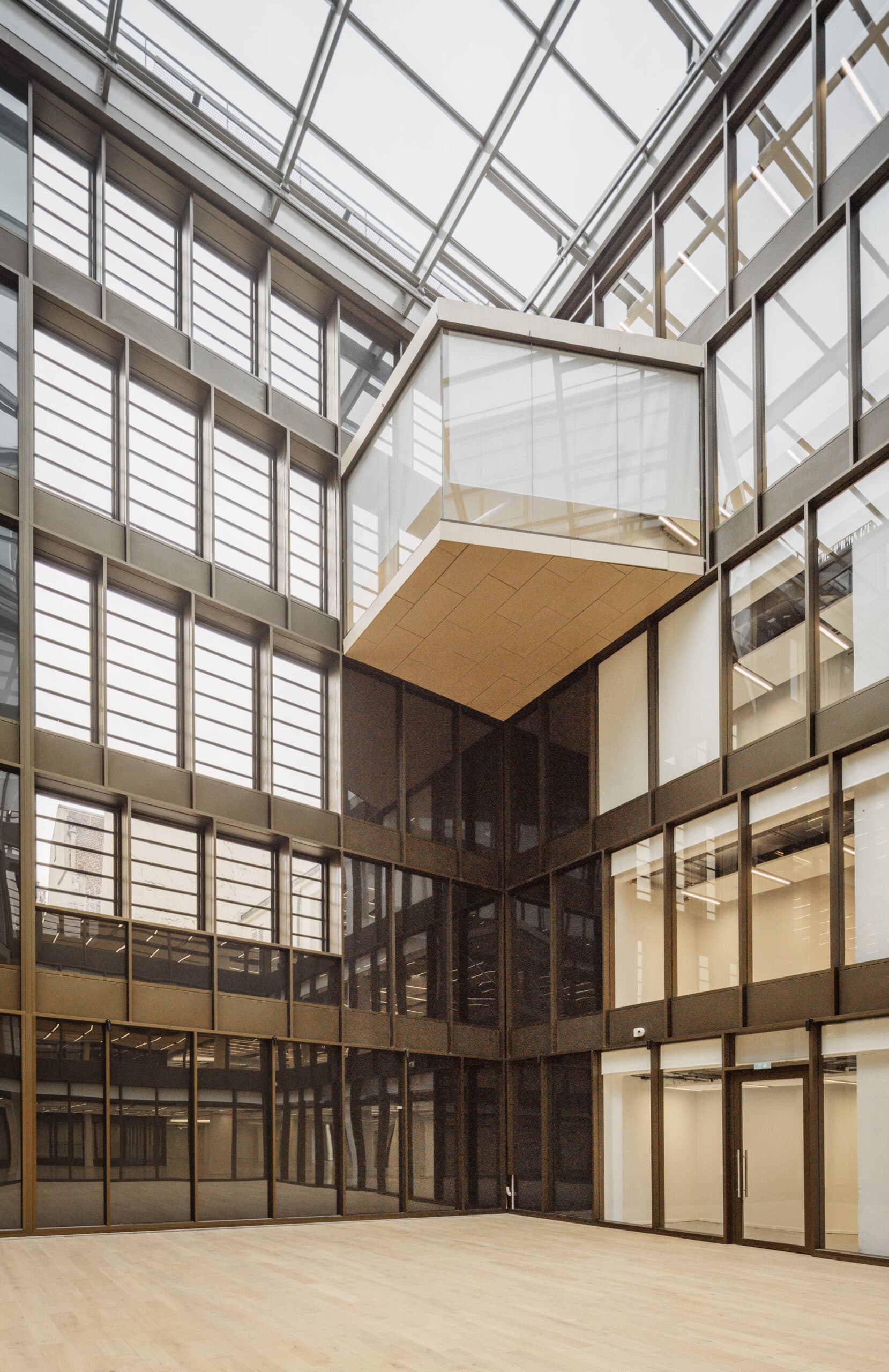 The current real estate complex being tired and very heterogeneous with its used office floors at different altimetries and atypical configurations, a partial demolition of the existing is a necessary prerequisite for its metamorphosis. Subsequently, a central atrium will be present within the project, creating an island of light fed by the zenith opening. A radiant light reflector will revive each interior space of this building. The facades of the atrium appear as a resonance from the inside to the outside, affirming to the city the new identity of the building. This project improves the penetration of natural light into the building thanks to its large glazed surfaces where light transmissions are over 80%.