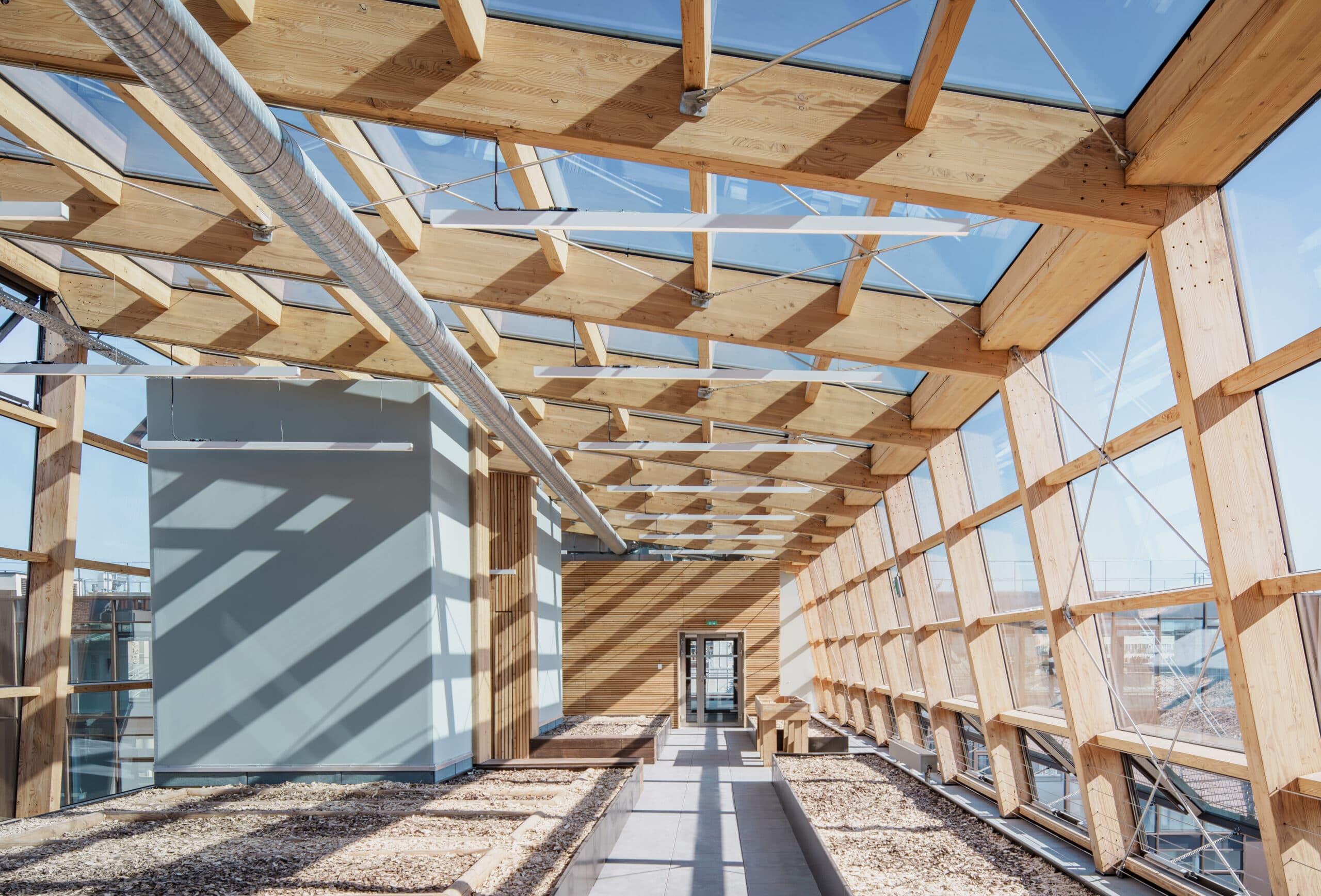 More articlesMore articlesRooftop extensions, built using dry construction methods, allow for vertical expansion of the project without requiring heavy work. This reduces site disturbances and promotes faster and less intrusive construction, while maintaining a minimal carbon footprint. In addition, a rainwater harvesting system has been put in place to water plants and use for toilets. Furthermore, the use of photovoltaic panels on the building's roofs allows for the generation of clean electricity from solar energy, thus contributing to reducing dependence on traditional energy sources and minimizing greenhouse gas emissions. Finally, LED lighting is widely used throughout the project for its low energy consumption and long lifespan. This technology not only reduces electricity consumption, but also creates bright and welcoming spaces for building occupants. By combining these various innovative technologies, the Mondo project demonstrates its commitment to environmental sustainability and energy efficiency, while offering a modern and comfortable work environment for its users. These combinations also justify Mondo's distinction by its exceptional energy performance, including the HQE Reference 2016 Excellent, Leed Gold, Well Gold, Biodiversity and Wirescore Gold labels.
