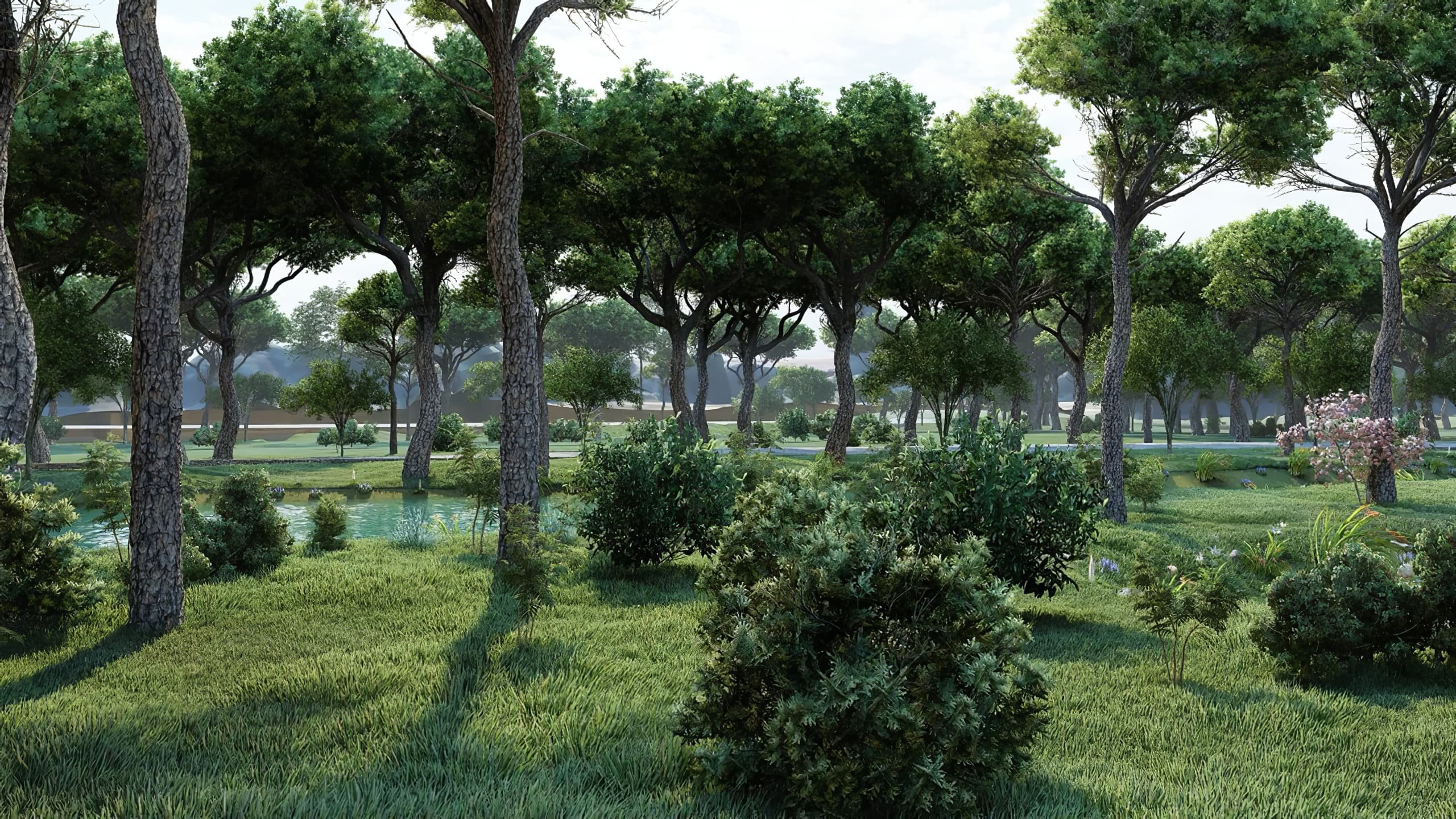 Ce parti d’aménagement est basé sur le respect et la mise en valeur des espaces naturels qui bordent l’opération, et axé sur l’aménagement d’un espace public de qualité, autour duquel se positionnent les équipements structurant du projet. Ainsi, L’objectif du projet est de venir insérer les bâtiments dans une coulée verte comme s’ils étaient une espèce végétale évoluant dans un environnement naturel.