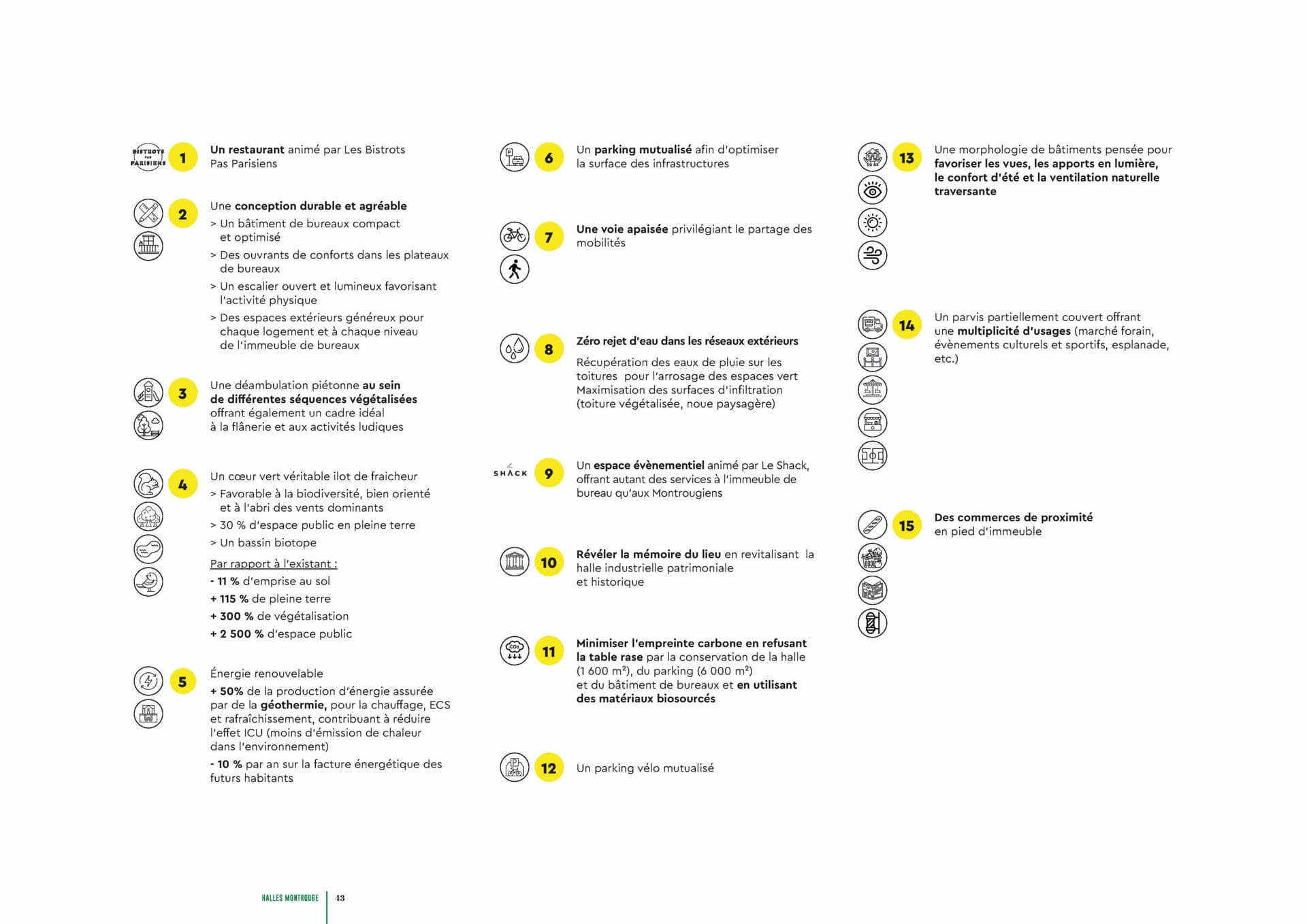 Initié par Lefebvre Sarrut et la ville de Montrouge, le projet est centré sur l’amélioration de la qualité de vie des habitants du quartier, il propose une mixité fonctionnelle unique avec des espaces verts, des commerces, un marché couvert, une crèche et un espace culturel. Une attention particulière est portée au développement d’un parc central de 4 300 m², conçu comme un point de convergence communautaire et un havre de biodiversité. Le projet se distingue par son approche intégrée, qui mêle vie urbaine, culture, et respect de l’environnement. Les Halles de Montrouge visent à revitaliser le quartier tout en offrant des logements de qualité adaptés aux divers besoins des résidents. L’accent est mis sur la durabilité, avec l’utilisation de géo-énergie et une gestion éco-responsable de l’eau. En promouvant les mobilités douces et un urbanisme axé sur le bien-être, ce projet incarne la vision d’un quartier apaisé, désenclavé et centré sur l’humain.