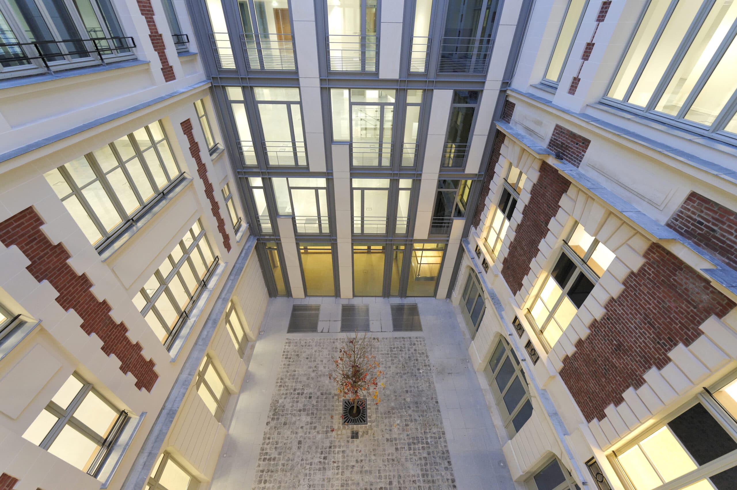 Le dessin des nouvelles façades décline le nombre d’or dans des rythmes musicaux en contrepoint de celles de l’hôtel, à l’image du patio venant dialoguer avec l’ancienne cour pavée. Trumeaux en pierre, structures et menuiseries métalliques, allèges et bow-windows engendrent une subtile modénature tout en creux et bossages. Le plancher en caillebotis des boîtes en verre favorise le rafraîchissement des plateaux juste en laissant leurs baies intérieures ouvertes.